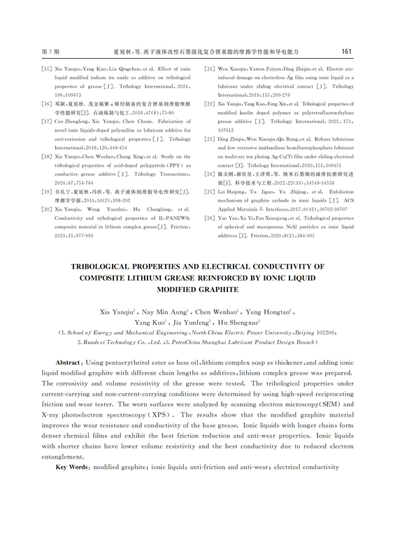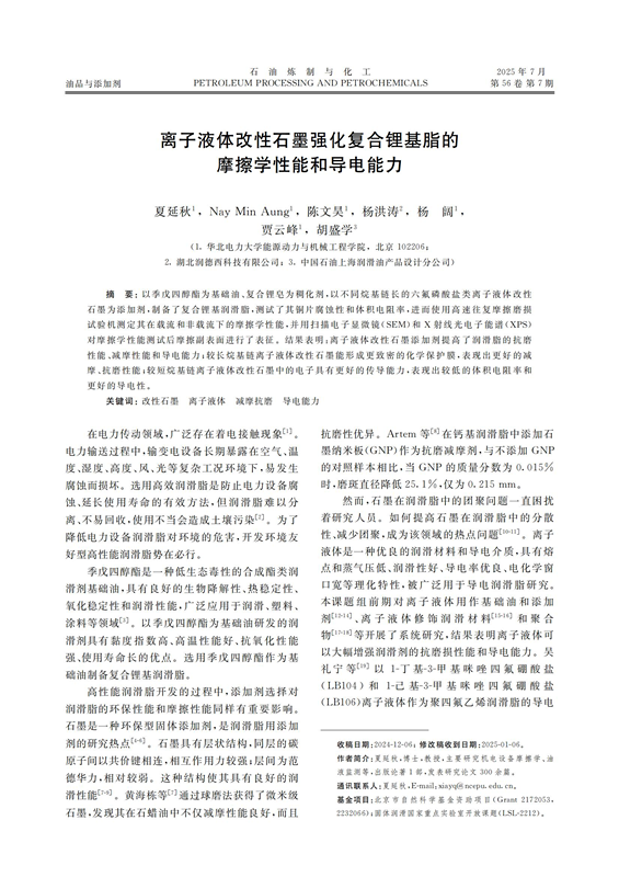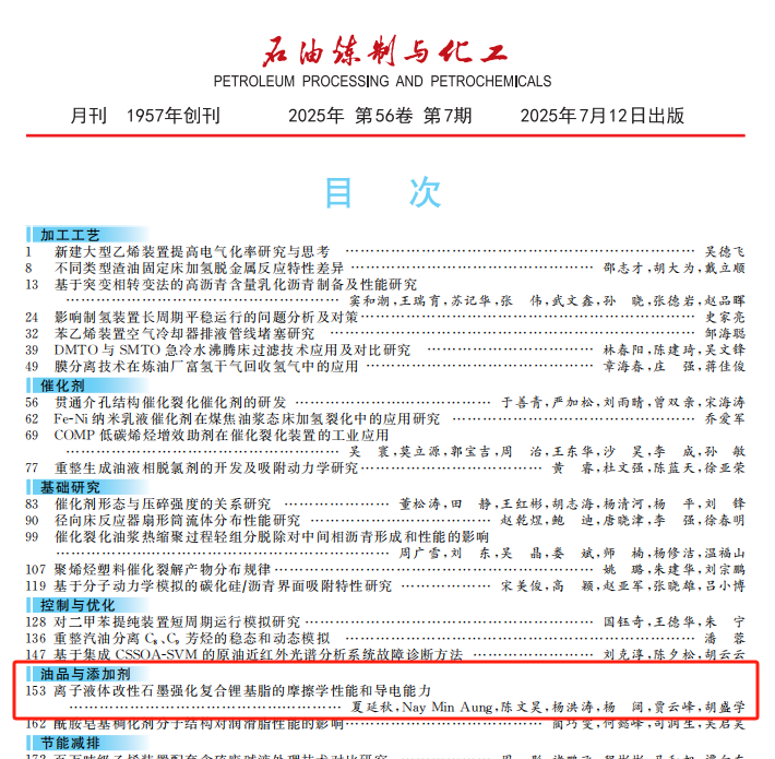 2025年7月,潤(rùn)德西攜手華北電力大學(xué)、中國(guó)石油上海潤(rùn)滑油產(chǎn)品設(shè)計(jì)分公司共同研究撰寫(xiě)的論文《離子液體改性石墨強(qiáng)化復(fù)合鋰基脂的摩擦學(xué)性能和導(dǎo)電能力》成功發(fā)表在權(quán)威期刊《石油煉制與化工》上(2025年7月,第56卷,第7期)。祝賀潤(rùn)德西學(xué)術(shù)研究再獲認(rèn)可!