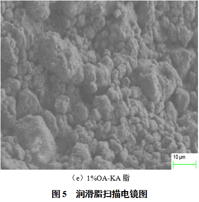 圖5為5種潤滑脂的掃描電鏡圖。由圖5可知,采用浸泡法去除基礎(chǔ)油后,在掃描電鏡下觀察到PTFE基礎(chǔ)脂主要是近球狀的聚四氟乙烯稠化劑分子,表現(xiàn)為較為致密的網(wǎng)狀結(jié)構(gòu),由于稠化劑性質(zhì)和結(jié)構(gòu)對(duì)潤滑脂的理化性能有重要影響,僅以PTFE基礎(chǔ)脂就表現(xiàn)出較好的耐熱性能;添加硅酸鹽微粉的潤滑脂通過分子間氫鍵使?jié)櫥羌芨鼮橹旅?,整體結(jié)構(gòu)表現(xiàn)出更好的關(guān)聯(lián)性,因而使?jié)櫥木C合性能進(jìn)一步提高[19]。
