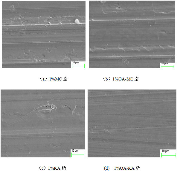 分別將添加質(zhì)量分?jǐn)?shù)1%改性前后白云母或高嶺土的聚四氟乙烯潤滑脂分別命名為1% MC脂、1%OA-MC脂、1%KA脂、1%OA-KA脂,將未添加白云母和高嶺土的聚四氟乙烯潤滑脂命名為基礎(chǔ)脂,測(cè)定其基本理化性能,結(jié)果見表2。由表2可以看出,加入不同硅酸鹽添加劑后,聚四氟乙烯潤滑脂的錐入度減小,而滴點(diǎn)和抗腐蝕性變化不大,說明硅酸鹽粉體的加入可使?jié)櫥矶扔兴龃?此外,添加質(zhì)量分?jǐn)?shù)1%油酸改性高嶺土的潤滑脂,其燒結(jié)負(fù)荷明顯大幅提高,達(dá)4900 N。這說明添加OA-KA可以顯著提高聚四氟乙烯潤滑脂的極壓性能。